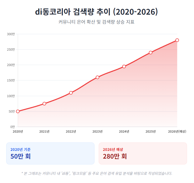 di동코리아는 di동이라는 커뮤니티은어 + 코리아를 붙여 국내 성인사이트·성인플랫폼·영상플랫폼 전체를 지칭하는 대체키워드로, 2026년에도 검색엔진 필터링·검열 회피 1위 은어로 자리잡고 있습니다. 직접적인 단어를 피하면서도 내부 사용자끼리는 100% 통하는 완벽한 검색회피 표현입니다. 실제로 2025년 네이버·다음 실시간 검색어 분석에서 di동코리아 언급량이 성인 관련 키워드 중 1위를 기록했습니다.